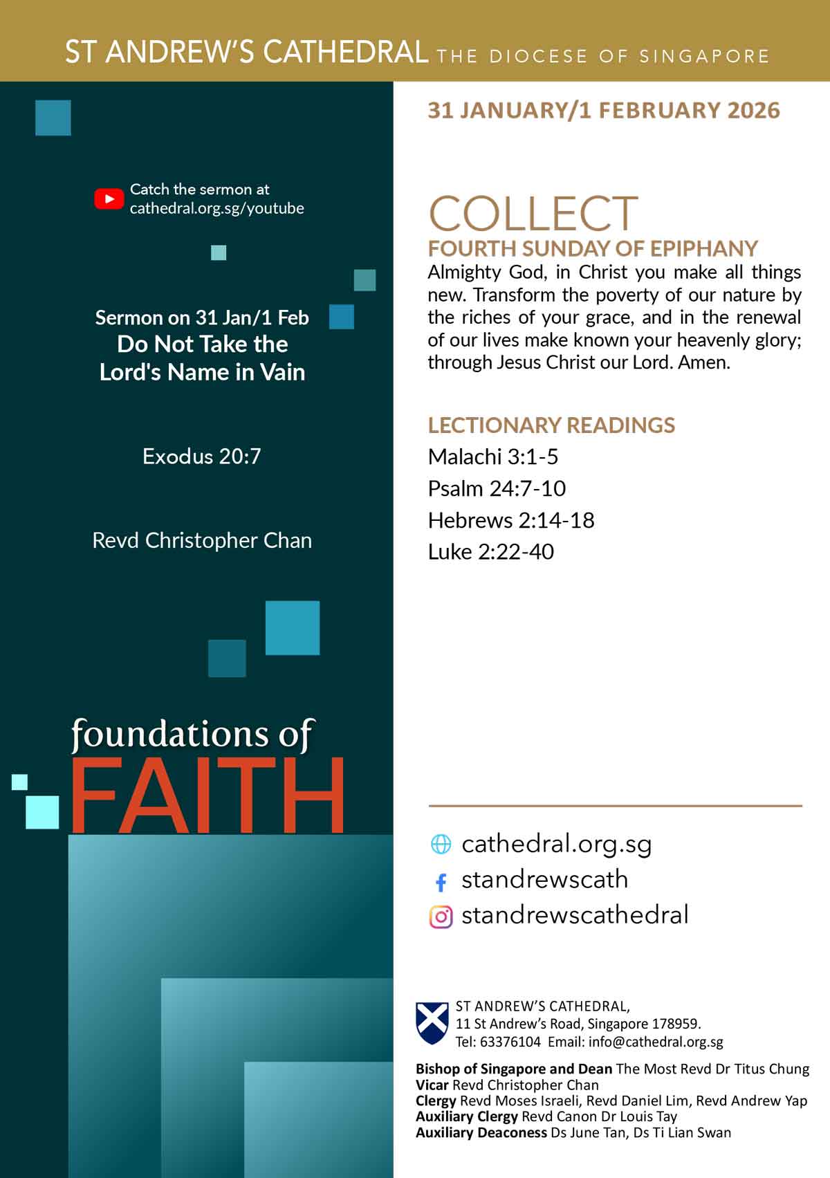Fourth Sunday of Epiphany Download PDF https://cathedral.org.sg/260201-fourth-sunday-of-epiphany Third Sunday of Epiphany Download PDF https://cathedral.org.sg/260125-third-sunday-of-epiphany Second Sunday of Epiphany Download PDF https://cathedral.org.sg/260118-second-sunday-of-epiphany First Sunday of Epiphany Download PDF https://cathedral.org.sg/260111-first-sunday-of-epiphany Second Sunday of Christmas Download PDF https://cathedral.org.sg/260104-second-sunday-of-christmas Past Bulletins 25 Jan | Third Sunday of Epiphany 18 Jan | Second Sunday of Epiphany 11 Jan | First Sunday of Epiphany ARCHIVES 2026 January 2025 December 2025 November 2025 October 2025 September 2025 August 2025 July 2025 June 2025 May 2025 April 2025 March 2025 February 2025 January 2024 December 2024 November 2024 October 2024 September 2024 August 2024 July 2024 June 2024 May 2024 April 2024 March 2024 February 2024 January 2023 December 2023 November 2023 October 2023 September 2023 August 2023 July 2023 June 2023 May 2023 April 2023 March 2023 February 2023 January 2022 December 2022 November 2022 October 2022 September 2022 August 2022 July 2022 June 2022 May 2022 April 2022 March 2022 February 2022 January 2021 December 2021 November 2021 October 2021 September 2021 August 2021 July 2021 June 2021 May 2021 April 2021 March 2021 February 2021 January 2020 December 2020 November 2020 October 2020 September 2020 August 2020 July 2020 June 2020 May 2020 April 2020 March 2020 February 2020 January 2019 December 2019 November 2019 October 2019 September 2019 August 2019 July 2019 June 2019 May 2019 April 2019 March 2019 February 2019 January Past issues 25 Jan Third Sunday of Epiphany 18 Jan Second Sunday of Epiphany 11 Jan First Sunday of Epiphany 4 Jan Second Sunday of Christmas ARCHIVES 2026 January 2026 January 2025 December 2025 November 2025 October 2025 September 2025 August 2025 July 2025 June 2025 May 2025 April 2025 March 2025 February 2025 January 2024 December 2024 November 2024 October 2024 September 2024 August 2024 July 2024 June 2024 May 2024 April 2024 March 2024 February 2024 January 2023 December 2023 November 2023 October 2023 September 2023 August 2023 July 2023 June 2023 May 2023 April 2023 March 2023 February 2023 January 2022 December 2022 November 2022 October 2022 September 2022 August 2022 July 2022 June 2022 May 2022 April 2022 March 2022 February 2022 January 2021 December